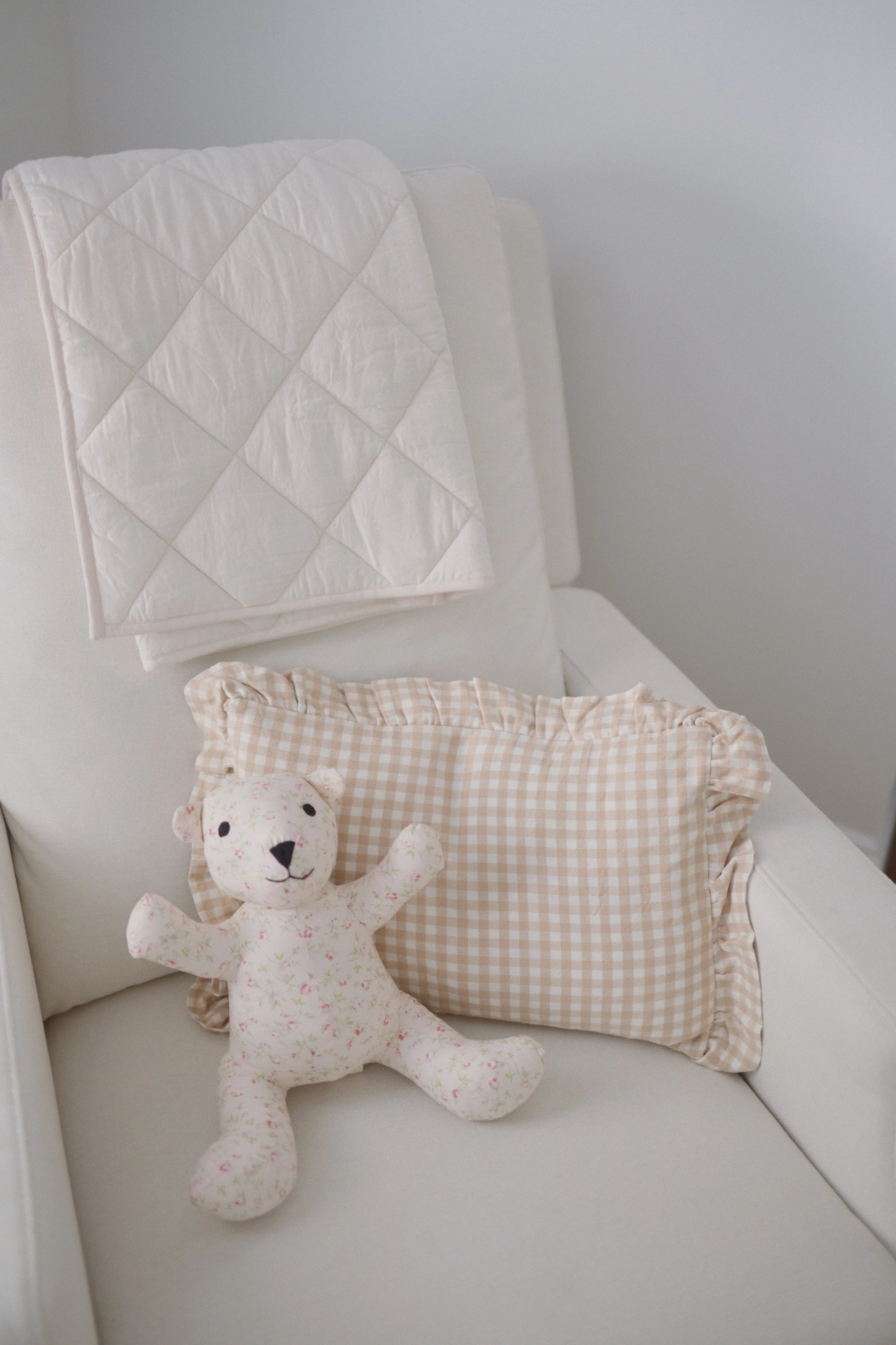 I instantly fell in love with this recliner from Million Dollar Baby — it might be our favorite piece in the nursery. We have it in the Performance Cream Eco-Weave. The fabric is water-repellent and stain-resistant, making it the perfect spot for nursing and feeding baby girl. And the fabric is made from recycled water bottles — how cool is that? Not that you could tell, it has such a luxurious texture and feel. Truly our favorite spot in the house as we wait for Isabel’s arrival. I dressed it up with a gingham pillow from Heather Taylor Home and it’s just perfect.