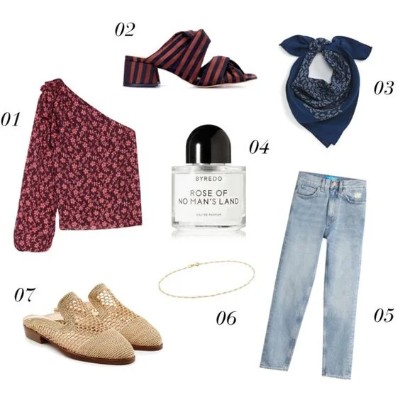 01. Blouse―Ulla Johnson / 02. Sandals―Ganni / 03. Scarf―Janessa Leone / 04. Perfume―Byredo / 05. Jeans―M.I.H. / 06. Anklet―Ariel Gordon / 07. Mules―Robert Clergerie